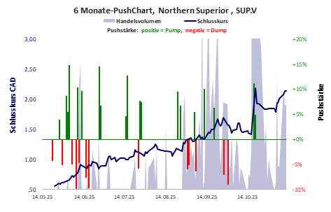 Die Pushstärke ist ein Maß, wie stark der Handelskurs der jüngsten Zeit vom Durchschnitt der Vergangenheit abweicht, und belegt somit Pushaktivitäten