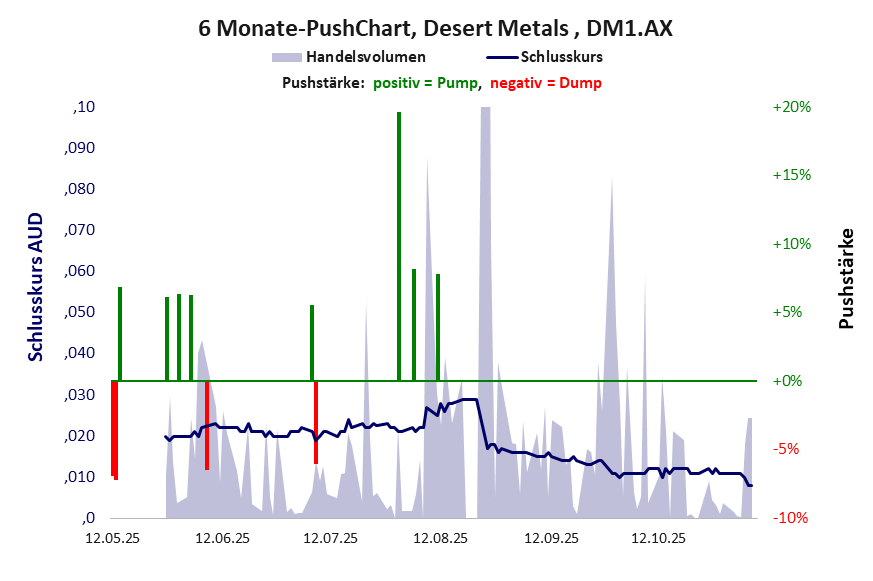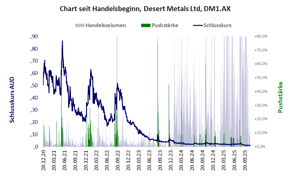 Desert Metals hat ein unbefriedigendes Gesamtscoring und ist ein mickriger Pennystock mit praktisch einem Totalverlust. Das Gesamtvermögen ist überschaubar, die Vermögenswerte scheinen werthaltig zu sein, der Umsatz ist nicht existent, die Ertragslage extrem verlustreich, die Geldverbrennung sehr hoch.