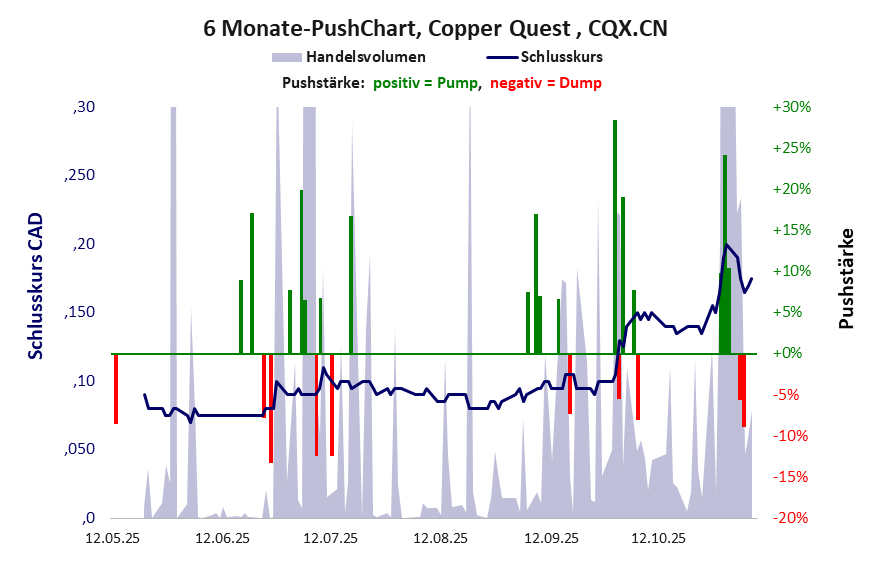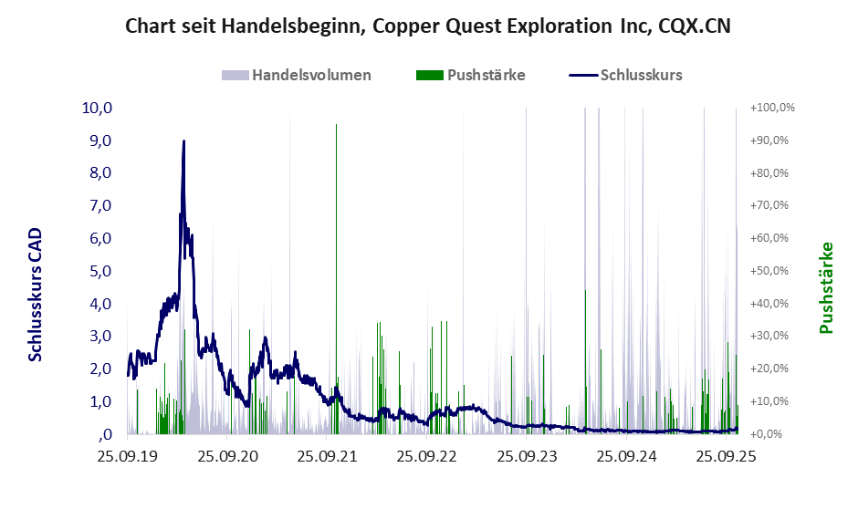 Copper Quest hat ein inakzeptables Gesamtscoring und ist ein mickriger Pennystock mit einem riesigen Kursverlust. Das Gesamtvermögen ist karg, die Vermögenswerte scheinen nicht vorhanden zu sein, der Umsatz ist nicht existent, die Ertragslage extrem verlustreich, die Geldverbrennung extrem hoch.