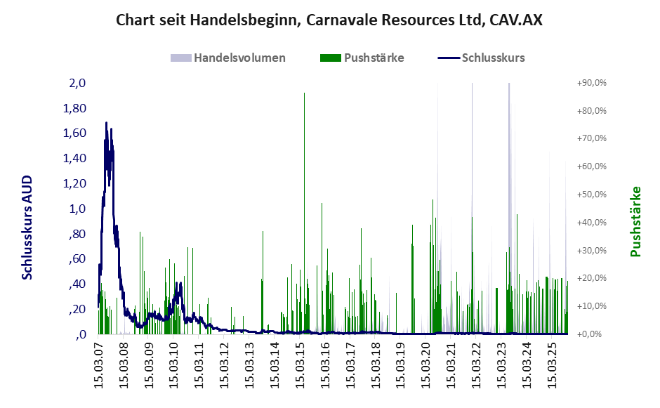Carnavale Resources hat ein kritisches Gesamtscoring und ist ein mickriger Pennystock mit praktisch einem Totalverlust. Das Gesamtvermögen ist überschaubar, die Vermögenswerte scheinen nicht werthaltig zu sein, der Umsatz ist nicht existent, die Ertragslage extrem verlustreich, die Geldverbrennung extrem hoch.