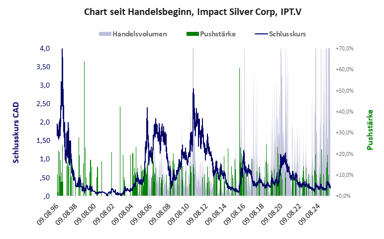 Impact Silver hat ein schwaches Gesamtscoring in Klasse D. Es ist ein kleiner Pennystock mit einem riesigen Kursverlust. Das Gesamtvermögen ist beträchtlich, die Vermögenswerte scheinen sehr werthaltig zu sein, der Umsatz ist beträchtlich, die Ertragslage schlecht, die Geldverbrennung hoch.