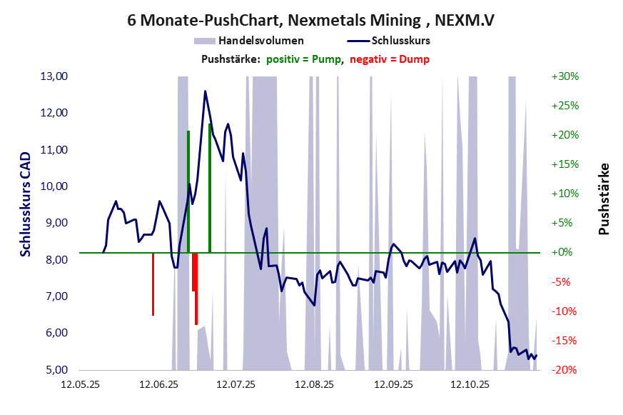 Nexmetals Mining hat ein unbefriedigendes Gesamtscoring und ist eine günstige Aktie mit einem riesigen Kursverlust. Das Gesamtvermögen ist überschaubar, die Vermögenswerte scheinen sehr werthaltig zu sein, der Umsatz ist nicht existent, die Ertragslage extrem verlustreich, die Geldverbrennung extrem hoch.