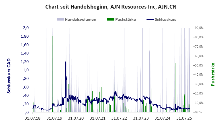 AJN Resources hat ein schlechtes Scoring in Klasse D. Es ist ein mickriger Pennystock mit einem erträglichen Kursverlust. Das Gesamtvermögen ist karg, die Vermögenswerte scheinen werthaltig zu sein, der Umsatz ist nicht existent, die Ertragslage extrem verlustreich, die Geldverbrennung extrem hoch.