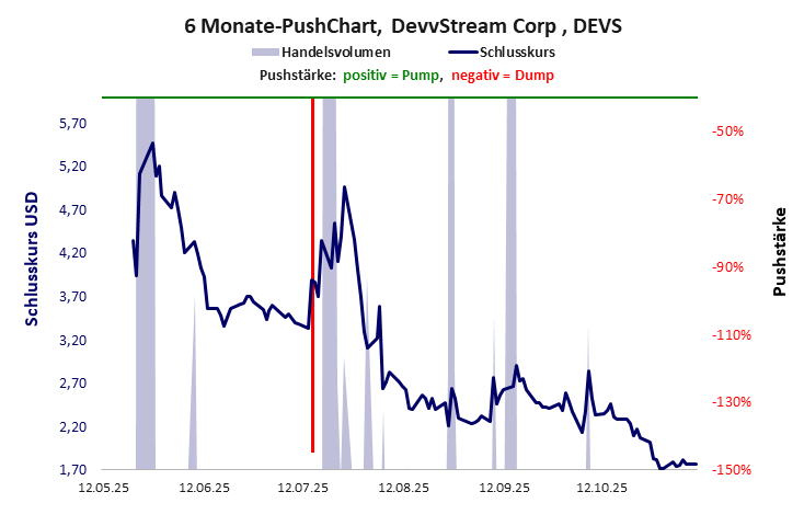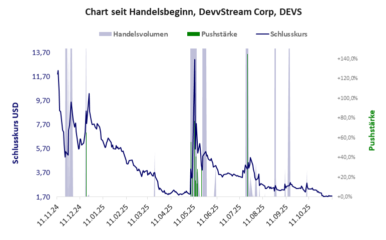 DevvStream Corp hat ein sehr schlechtes Scoring in Klasse D. Es ist eine billige Aktie mit einem riesigen Kursverlust. Das Gesamtvermögen ist karg, die Vermögenswerte scheinen nicht vorhanden zu sein, der Umsatz ist mickrig, die Ertragslage extrem verlustreich, die Geldverbrennung extrem hoch.