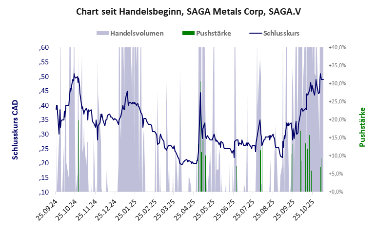SAGA Metals hat ein schlechtes Scoring in Klasse D. Es ist ein kleiner Pennystock mit Kursgewinn. Das Gesamtvermögen ist karg, die Vermögenswerte scheinen sehr werthaltig zu sein, der Umsatz ist nicht existent, die Ertragslage extrem verlustreich, die Geldverbrennung erträglich.
