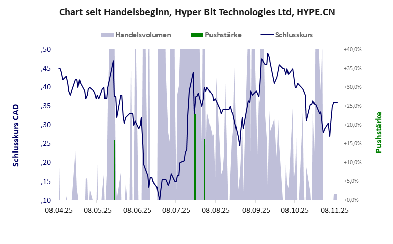 Hyper Bit hat ein sehr schlechtes Scoring in Klasse D. Es ist ein kleiner Pennystock mit einem erträglichen Kursverlust. Das Gesamtvermögen ist karg, die Vermögenswerte scheinen nicht vorhanden zu sein, der Umsatz ist nicht existent, die Ertragslage extrem verlustreich, die Geldverbrennung extrem hoch.