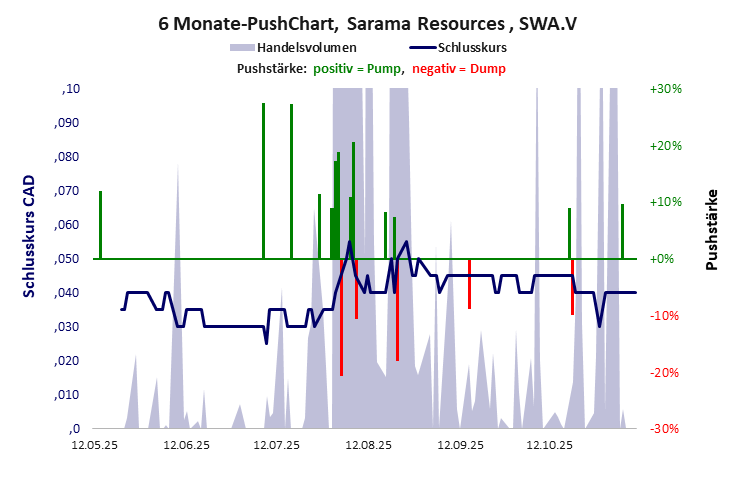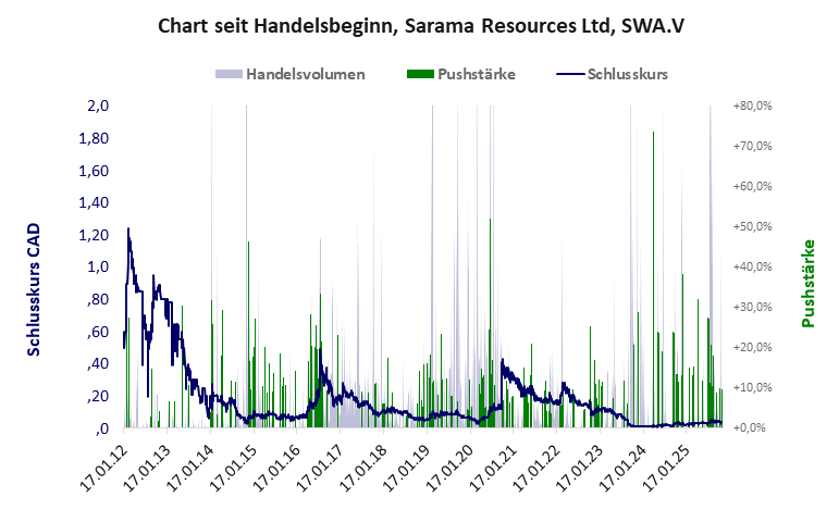 Sarama Resources hat ein schlechtes Scoring in Klasse D. Es ist ein mickriger Pennystock mit einem riesigen Kursverlust. Das Gesamtvermögen ist karg, die Vermögenswerte scheinen nicht werthaltig zu sein, der Umsatz ist nicht existent, die Ertragslage extrem verlustreich, die Geldverbrennung extrem hoch.