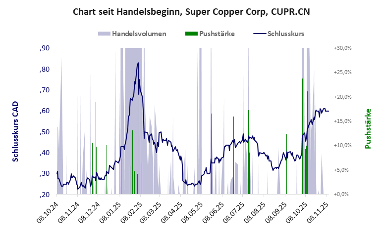 Super Copper hat ein schlechtes Scoring in Klasse D. Es ist ein Pennystock mit Kursgewinn. Das Gesamtvermögen ist karg, die Vermögenswerte scheinen nicht vorhanden zu sein, der Umsatz ist nicht existent, die Ertragslage extrem verlustreich, die Geldverbrennung extrem hoch.
