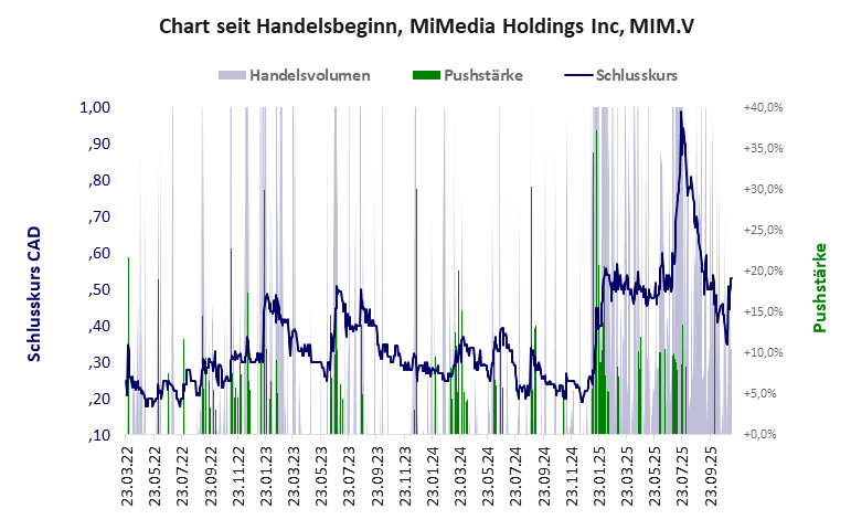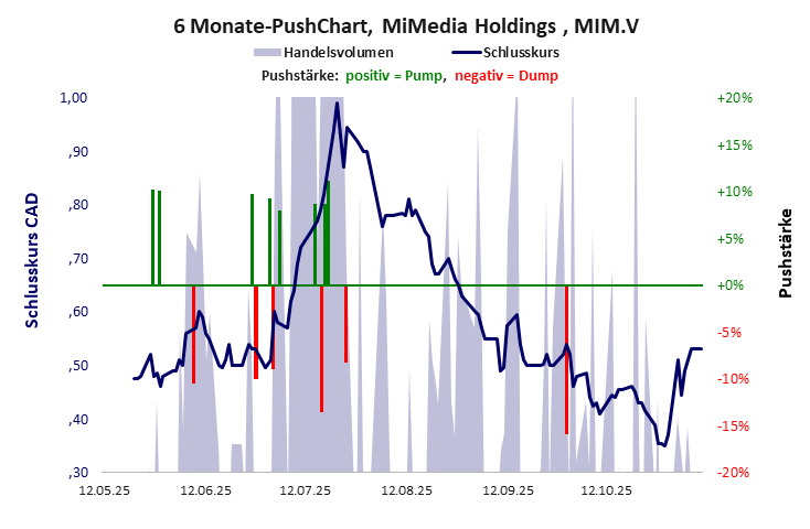 MiMedia Holdings hat ein schlechtes Scoring in Klasse D. Es ist ein kleiner Pennystock mit Kursgewinn. Das Gesamtvermögen ist karg, die Vermögenswerte scheinen nicht vorhanden zu sein, der Umsatz ist mickrig, die Ertragslage extrem verlustreich, die Geldverbrennung extrem hoch.