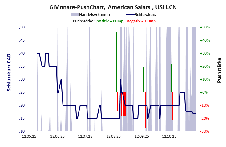 American Salars hat ein sehr schlechtes Scoring in Klasse D. Es ist ein mickriger Pennystock mit praktisch einem Totalverlust. Das Gesamtvermögen ist karg, die Vermögenswerte scheinen nicht werthaltig zu sein, der Umsatz ist nicht existent, die Ertragslage extrem verlustreich, die Geldverbrennung erträglich.