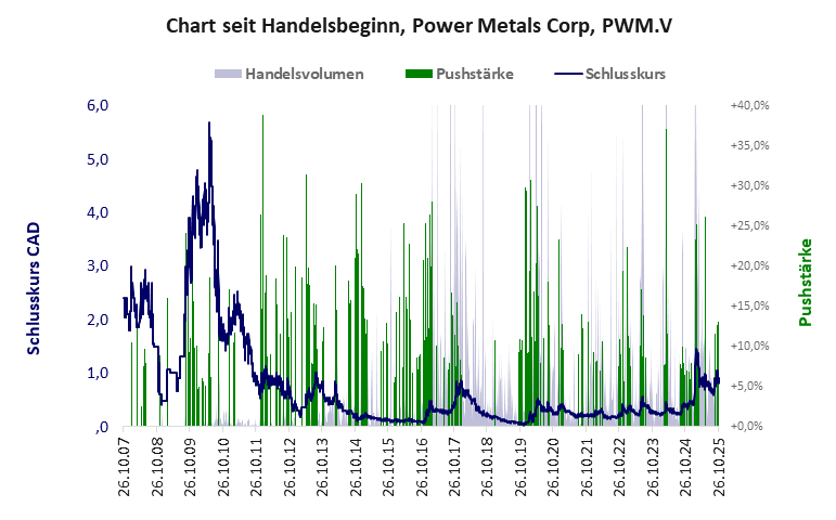 Power Metals hat ein schlechtes Scoring in Klasse D. Es ist ein Pennystock mit einem starken Kursverlust. Das Gesamtvermögen ist überschaubar, die Vermögenswerte scheinen sehr werthaltig zu sein, der Umsatz ist nicht existent, die Ertragslage extrem verlustreich, die Geldverbrennung extrem hoch.