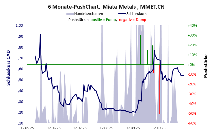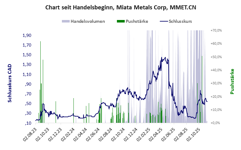Miata Metals hat ein schlechtes Scoring in Klasse D. Es ist ein Pennystock mit Kursgewinn. Das Gesamtvermögen ist karg, die Vermögenswerte scheinen nicht vorhanden zu sein, der Umsatz ist nicht existent, die Ertragslage extrem verlustreich, die Geldverbrennung gering.