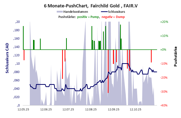 Fairchild Gold hat ein schlechtes Scoring in Klasse D. Es ist ein mickriger Pennystock mit einem starken Kursverlust. Das Gesamtvermögen ist karg, die Vermögenswerte scheinen sehr werthaltig zu sein, der Umsatz ist nicht existent, die Ertragslage extrem verlustreich, die Geldverbrennung extrem hoch.