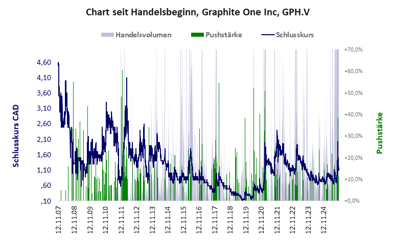 Graphite One hat ein schlechtes Scoring in Klasse D. Es ist eine billige Aktie mit einem starken Kursverlust. Das Gesamtvermögen ist beträchtlich, die Vermögenswerte scheinen nicht werthaltig zu sein, der Umsatz ist nicht existent, die Ertragslage extrem verlustreich, die Geldverbrennung ziemlich hoch.