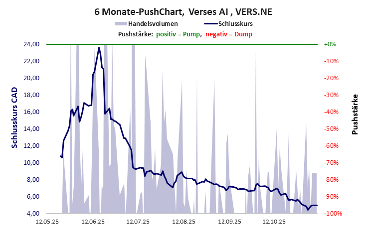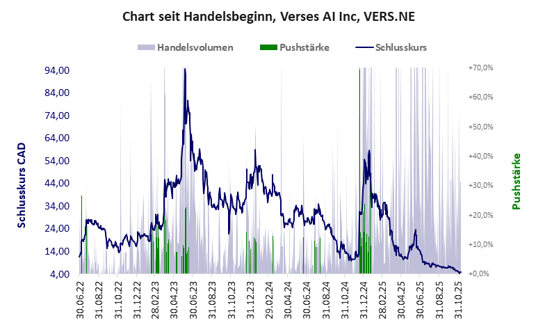 Verses AI hat ein schlechtes Scoring in Klasse D. Es ist eine günstige Aktie mit einem starken Kursverlust. Das Gesamtvermögen ist überschaubar, die Vermögenswerte scheinen nicht werthaltig zu sein, der Umsatz ist überschaubar, die Ertragslage extrem verlustreich, die Geldverbrennung extrem hoch.