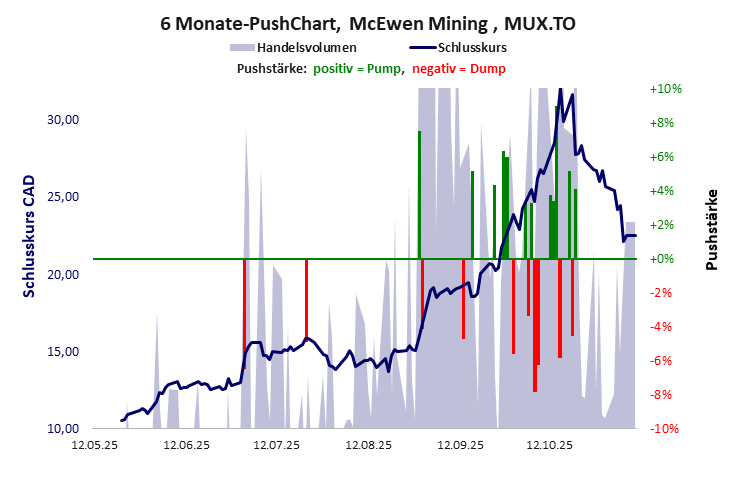 McEwen Mining hat ein unbefriedigendes Scoring in Klasse D. Es ist eine günstige Aktie mit einem starken Kursverlust. Das Gesamtvermögen ist groß, die Vermögenswerte scheinen noch werthaltig zu sein, der Umsatz ist sehr groß, die Ertragslage schlecht, die Geldverbrennung sehr hoch.