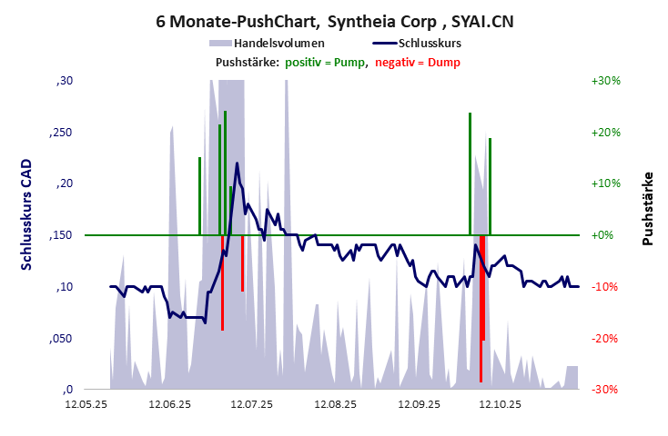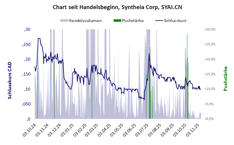Syntheia Corp hat ein sehr schlechtes Gesamtscoring in Klasse D. Es ist ein mickriger Pennystock mit einem starken Kursverlust. Das Gesamtvermögen ist karg, die Vermögenswerte scheinen nicht werthaltig zu sein, der Umsatz ist nicht existent, die Ertragslage extrem verlustreich, die Geldverbrennung erträglich.