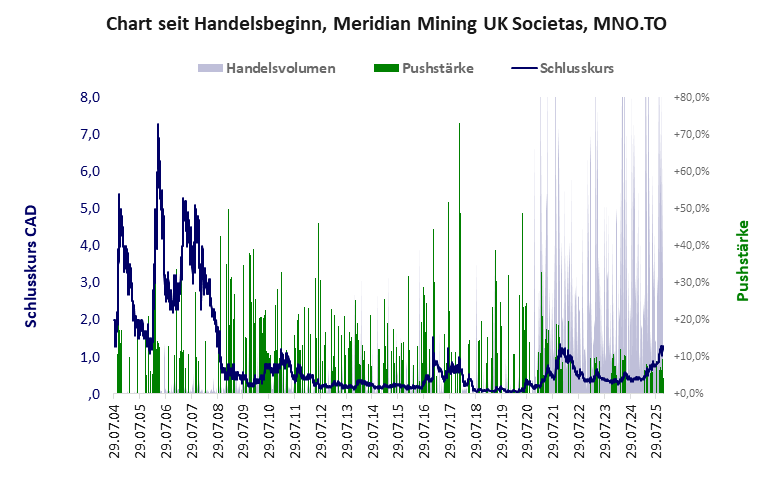 Meridian Mining hat ein schlechtes Scoring in Klasse D. Es ist eine billige Aktie mit einem starken Kursverlust. Das Gesamtvermögen ist überschaubar, die Vermögenswerte scheinen noch werthaltig zu sein, der Umsatz ist nicht existent, die Ertragslage extrem verlustreich, die Geldverbrennung extrem hoch.