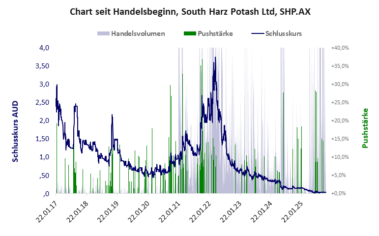 South Harz hat ein unbefriedigendes Scoring in Klasse D. Es ist ein mickriger Pennystock mit praktisch einem Totalverlust. Das Gesamtvermögen ist karg, die Vermögenswerte scheinen nicht werthaltig zu sein, der Umsatz ist nicht existent, die Ertragslage extrem verlustreich, die Geldverbrennung extrem hoch.