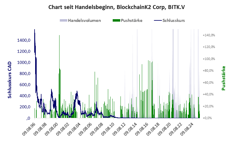 BlockchainK2 Corp hat ein miserables Gesamtscoring in Klasse D. Es ist ein mickriger Pennystock mit praktisch einem Totalverlust. Das Gesamtvermögen ist karg, die Vermögenswerte scheinen nicht vorhanden zu sein, der Umsatz ist überschaubar, die Ertragslage extrem verlustreich, die Geldverbrennung extrem hoch.