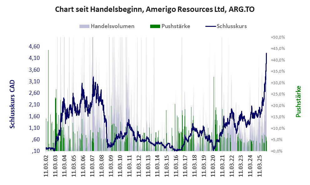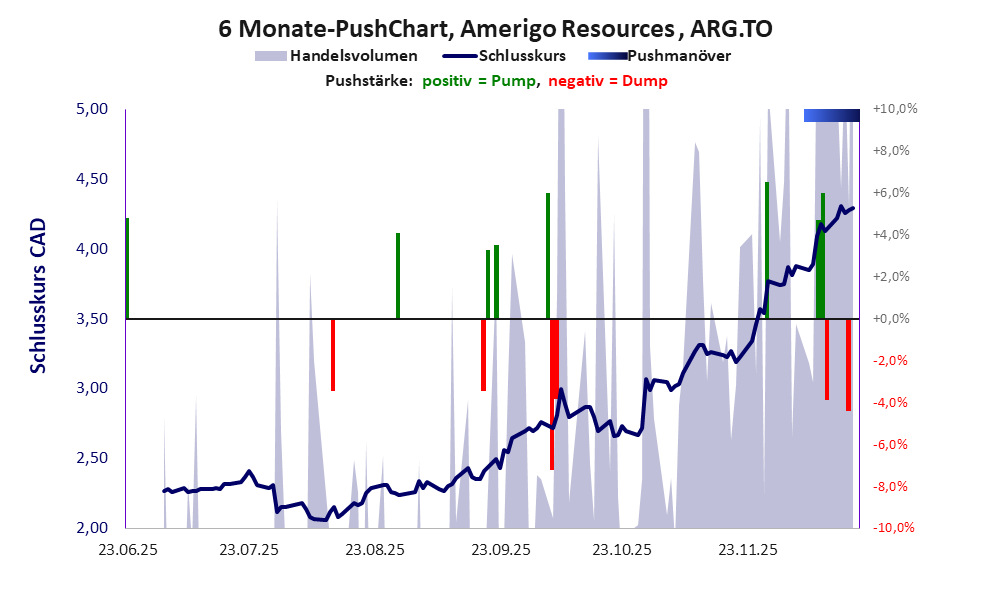 Die Pushstärke ist ein Maß, wie stark der Handelskurs der jüngsten Zeit vom Durchschnitt der Vergangenheit abweicht, und belegt somit Pushaktivitäten