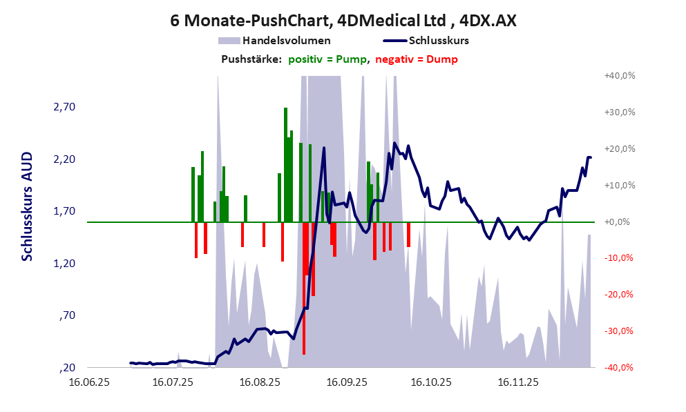 Die Pushstärke ist ein Maß, wie stark der Handelskurs der jüngsten Zeit vom Durchschnitt der Vergangenheit abweicht, und belegt somit Pushaktivitäten