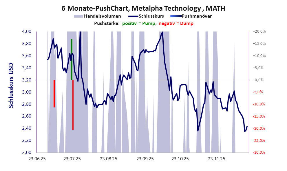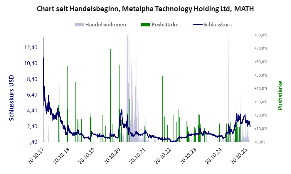 Anmerkungen zur Aktie: Metalpha startete mit einem offensichtlich überzogenen Aktienkurs, der innerhalb von 14 Tagen um 50% einbrach. Die weitere Kursentwicklung ist geprägt von laufenden Pushmanövern. Seit 2025 wird der Kurs wieder angetrieben und stieg um runde 150%. Wie wird es an der FWB weiter gehen?
