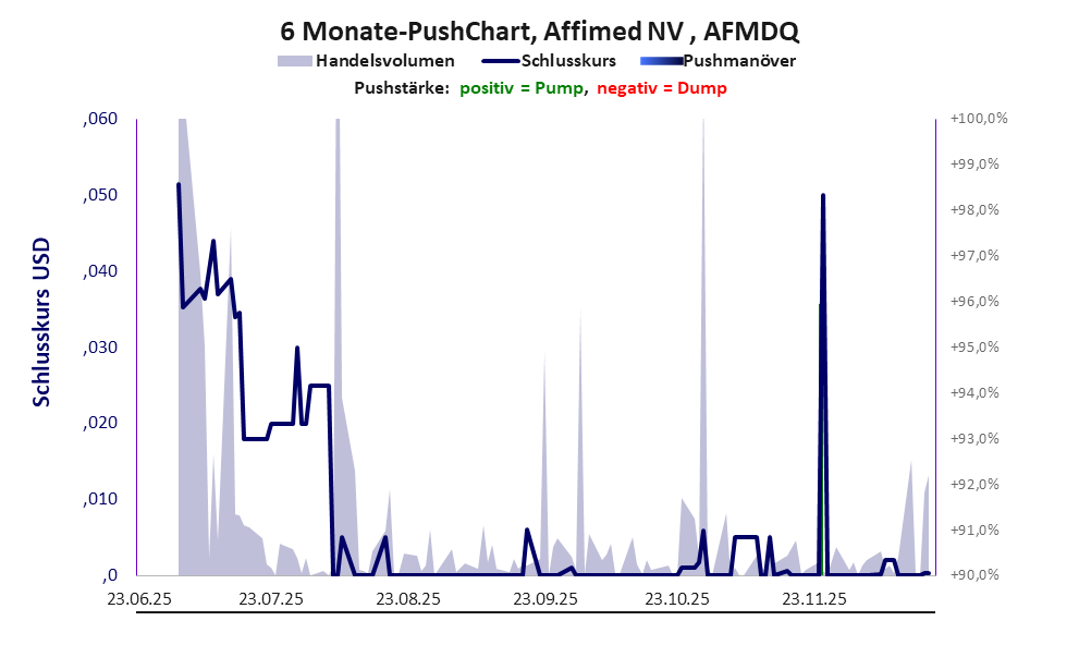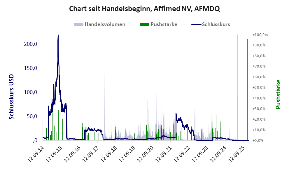 Anmerkungen zur Aktie: Affimed hat am 13.05.2025 den Insolvenz-Antrag beim Gericht in Mannheim eingereicht. Es gibt keine Prognosen, ob das Unternehmen, das stark überschuldet ist, weitergeführt werden kann. Die Delistings an der Nasdaq und an der FWB und der Wechsel zum OTC-Markt zeigen, dass die Firma wohl aufgelöst werden wird. Es wird als unwahrscheinlich angesehen, Käufer zu finden.