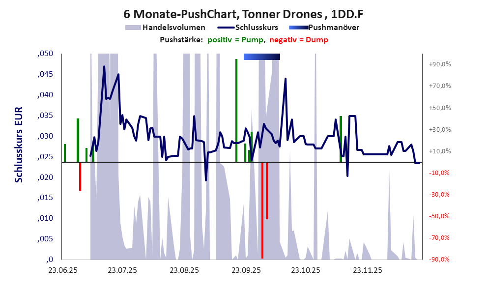 Anmerkungen zur Aktie: Die Einstufung der Aktie unter den Crime-Aktien ist gewagt. Für Tonner Drones gilt jedenfalls die Unschuldvermutung. Die Dumps, die jedoch laut Chart nachweislich stattfanden, lassen keine andere Wahl als die Aktie der Kategorie Crime zuzuordnen.