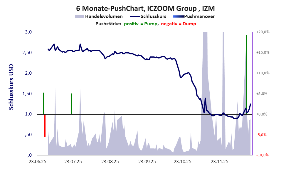 Anmerkungen zur Aktie: Iczoom zählt zu einer Gruppe chinesischer Firmen deren Aktien in den USA oder auf den Antillen beheimatet sind und die auf der Warnliste der BaFin stehen. Der Aktienkurs dieser Firmen zeigt schlagartig durchgeführte Dumps, mit denen die Anleger (oft in Chatgruppen organisiert) um ihr Geld betrogen wurden. Charakteristisch ist für die meisten dieser Firmen, dass ihr Scoring meist recht gut und einer der Gründe ist, Anleger erfolgreich hinter das Licht geführt zu haben. Die Pushstärke zeigt allerdings das Risiko auf. Iczoom könnte nach vorsichtiger Schätzung bei dem Dump mehr als eine halbe Milliarde USD abgeräumt haben. Die Geschichte, wie abgezockt wird, steht unter „Am Handy abgezockt„.