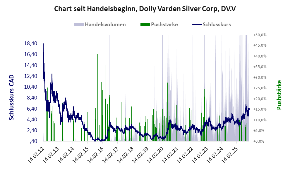 Anmerkungen zur Aktie: Dolly Varden ist ein typischer Vertreter der Junior Miners, denen man das Ziel abnehmen kann, eine Lagerstätte erfolgreich aufschließen zu wollen. Vom Standpunkt des Geologen, des Explorers, der Shareholder und der spekulativ ausgerichteten Finanziers hat das Unternehmen alle Chancen, erfolgreich zu sein. Dass Dolly Varden seit 13 Jahren 135 Mio. CAD verbrannt, nein, investiert hat, ist ein Zeichen für die Nachhaltigkeit der Exploration und nicht für deren Erfolglosigkeit. Um das Geld für die Exploration zu beschaffen, braucht es natürlich möglichst viele positive Nachrichten wie jüngst die laute Ankündigung des Listings der Aktie an der New York Stock Exchange. Gutes Marketing ist ein wichtiges Instrument zur Finanzierung der Ausgaben. Und Marketing war noch nie der Sachwalter der Realität. Wer dem Marketing von tüchtigen Junior Miners, wie es Dolly Varden ist, glaubt, der wird an den erfolgreichen Aufschluss der Mine glauben. Das ist die eine Seite der Medaille. Die andere Seite besteht aus der nüchternen Bewertung der Fakten, die z.B. Simply Wall zu dem Urteil führt, außer einem soliden Unternehmenszustand herrscht vorwiegend Risiko vor. Sieht man sich die Unternehmenspräsentation an, so gibt es viel Schmuck für die Augen, aber wenig Fakten für den Erfolg. Die Resourcenschätzung besteht lediglich aus indicated and inferred resources, ist also weit entfernt von belastbaren Reservenangaben. Die finanzielle Situation ist schlecht, denn es fehlen Erträge und die Exploration verschlingt jedes Jahr rund 20 Mi0. CAD. Die Liste der Manager, die sich an Dolly Varden versuchten, ist lang und Eric Sprott als Shareholder mit winzigen zwei Prozent ist auch kein Erfolgsgarant. Bilanziert man nüchtern ohne die Blütenträume, auf den großen Silberschatz zu stoßen, dann bleiben nur die Tatsachen, dass die Finanzdaten schlecht sind und der Aktienkurs laufend gepusht wird. Welch soliden Anleger soll dieser Zustand dazu verlocken, diese Aktie zu kaufen? Das werden nur Zocker tun, die in den einschlägigen Foren aus persönlicher Überzeugung oder auf Geheiß nicht müde werden, Dolly Varden als den großen Wurf auszuloben, wenn man nur ein bisschen Geduld und Zuversicht habe. Und das seit gut einem Jahrzehnt?