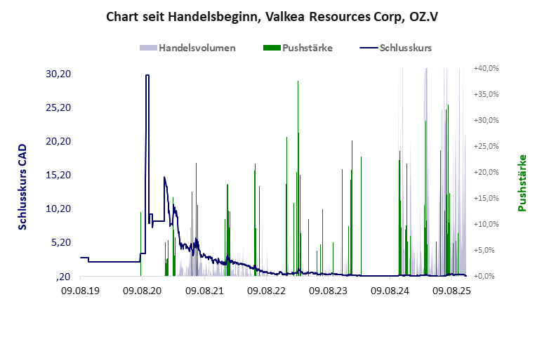 Valkea Resources hat ein schlechtes Gesamtscoring und ist ein kleiner Pennystock mit einem riesigen Kursverlust. Das Gesamtvermögen ist überschaubar, die Vermögenswerte scheinen sehr werthaltig zu sein, der Umsatz ist nicht existent, die Ertragslage extrem verlustreich, die Geldverbrennung extrem hoch.