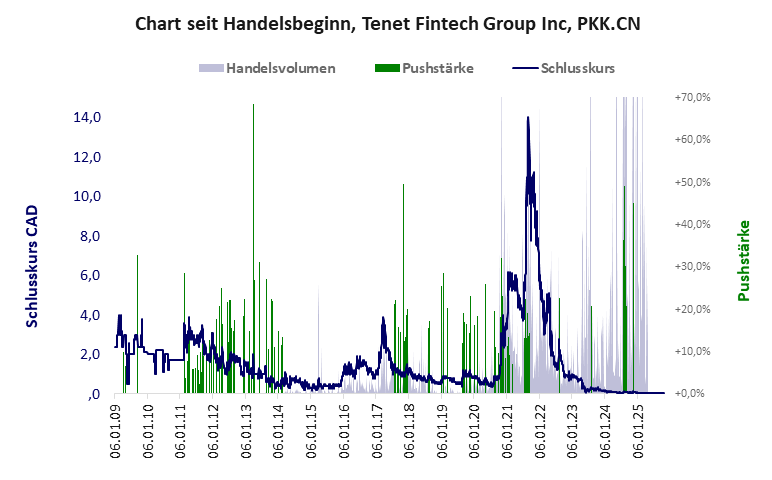 Tenet Fintech hat ein unbefriedigendes Gesamtscoring und ist ein mickriger Pennystock mit praktisch einem Totalverlust. Das Gesamtvermögen ist beträchtlich, die Vermögenswerte scheinen nicht werthaltig zu sein, der Umsatz ist überschaubar, die Ertragslage extrem verlustreich, die Geldverbrennung extrem hoch.