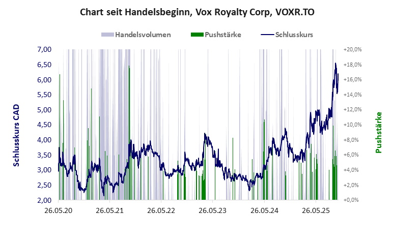 Vox Royalty hat ein sehr gutes Gesamtscoring und ist eine günstige Aktie mit Kursgewinn. Das Gesamtvermögen ist beträchtlich, die Vermögenswerte scheinen sehr werthaltig zu sein, der Umsatz ist beträchtlich, die Ertragslage schlecht, der Vermögensverlust erträglich.
