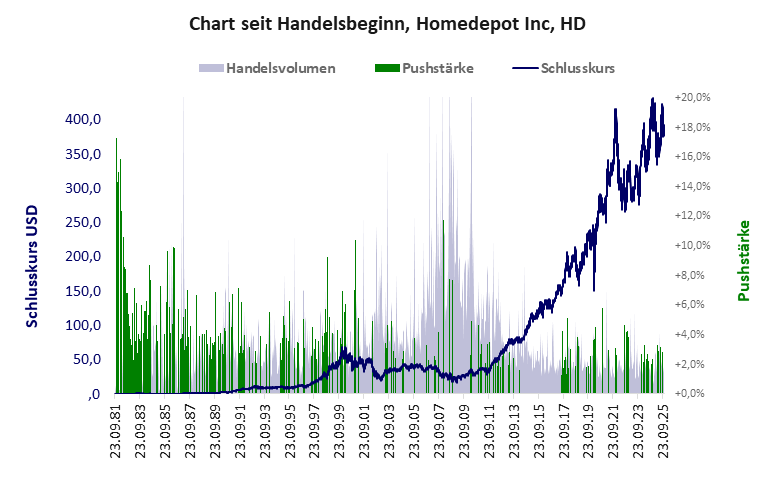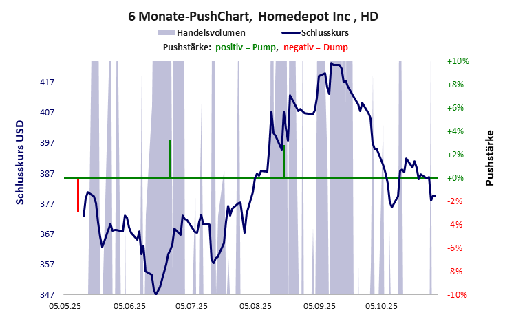 Die Pushstärke ist ein Maß, wie stark der Handelskurs der jüngsten Zeit vom Durchschnitt der Vergangenheit abweicht, und belegt somit Pushaktivitäten