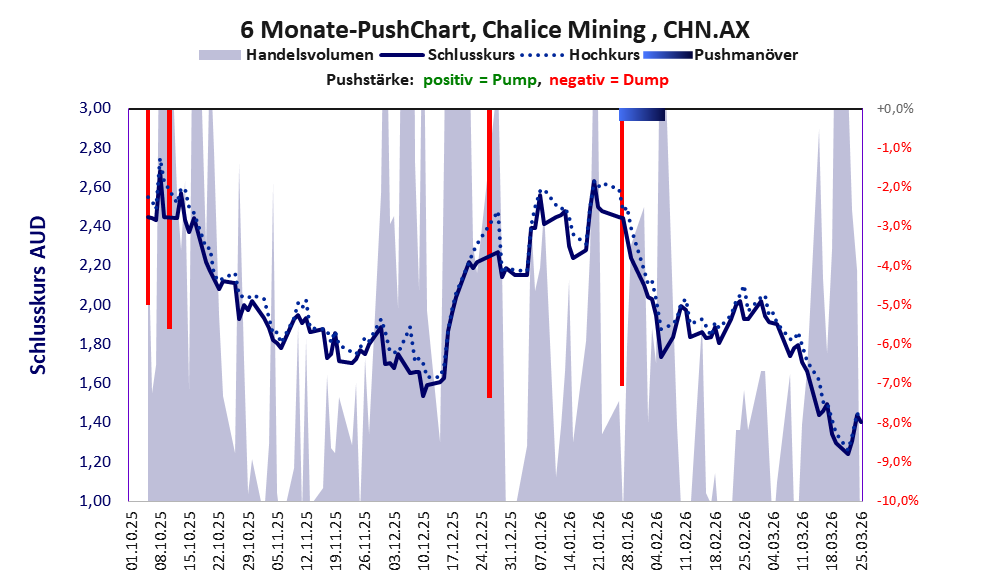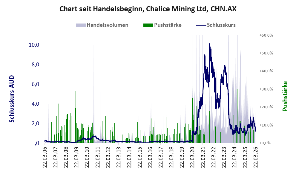 Über diese Aktie berichtet Goldinvest. Das tägliche Handelsvolumen betrug an obiger Börse während der letzten drei Monate bis Berichtsdatum: 2.162.645 Stück, das sind 0,6% der ausgegebenen Aktien. Bei Chalice Mining wird bei schwachen operativen Geschäft zu viel Geld verbrannt.