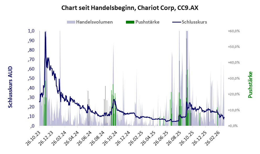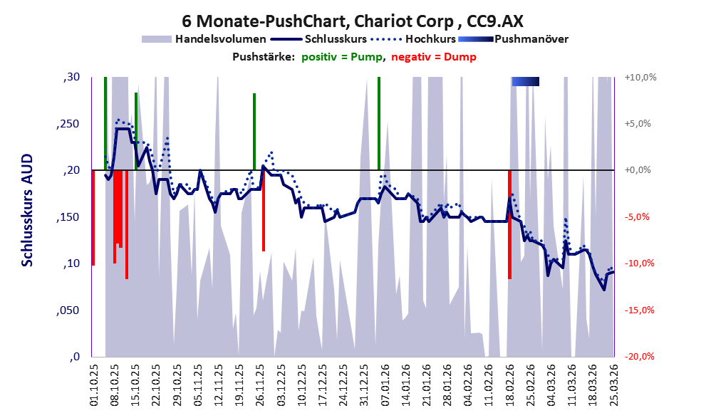 Bei dieser Aktie, über die INN berichtet, liegt das Inkassomodell vor und es gibt 1 Pump & Dump-Manöver. Das tägliche Handelsvolumen betrug an obiger Börse während der letzten drei Monate bis Berichtsdatum: 220.581 Stück, das sind 0,1% der ausgegebenen Aktien. Da Chariot Corp kaum Vermögen besitzt und unprofitabel ist, hat der Aktienkurs keinen Wert. Die Aktie dient in erster Linie Pushmanövern.