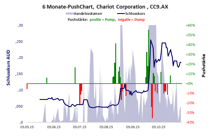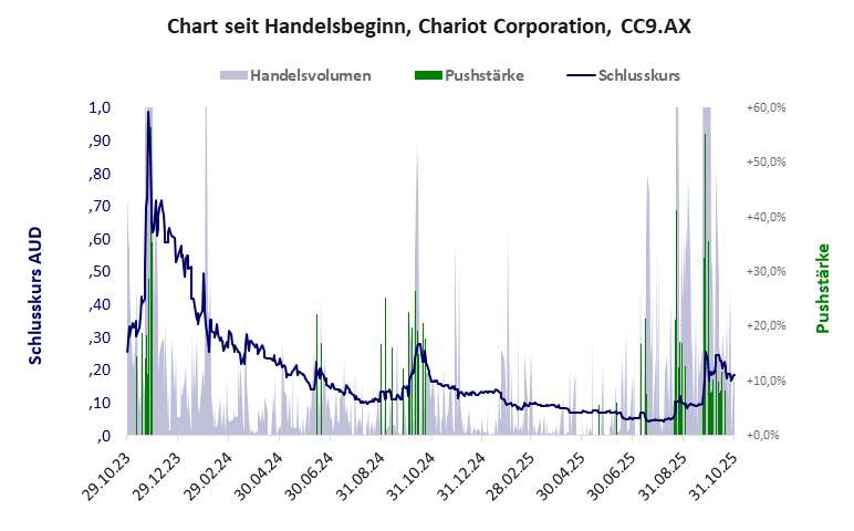 Chariot Corporation hat ein unbefriedigendes Gesamtscoring und ist ein mickriger Pennystock mit einem starken Kursverlust. Das Gesamtvermögen ist überschaubar, die Vermögenswerte scheinen nicht werthaltig zu sein, der Umsatz ist nicht existent, die Ertragslage extrem verlustreich, die Geldverbrennung extrem hoch.
