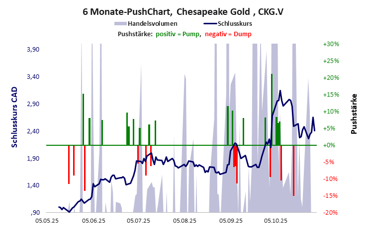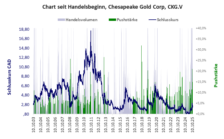 ein Explorationsdauerbrenner, der seit über 20 Jahren nichts findet, aber höchst erfolgreich im Kurspushing agiert. Chesapeake Gold hat ein akzeptables Gesamtscoring und ist eine billige Aktie mit einem starken Kursverlust. Das Gesamtvermögen ist groß, die Vermögenswerte scheinen nicht werthaltig zu sein, der Umsatz ist nicht existent, die Ertragslage extrem verlustreich, die Geldverbrennung ziemlich hoch.