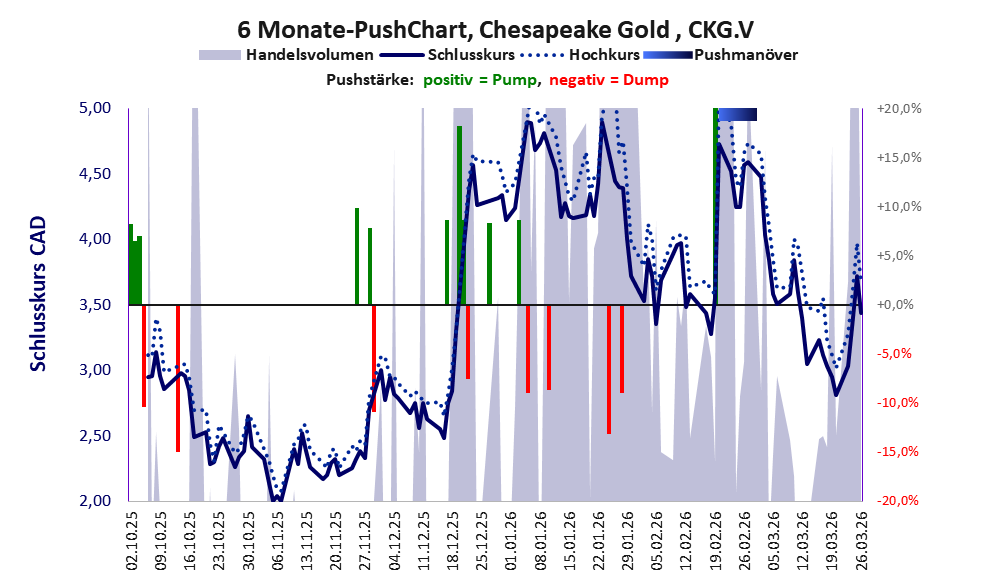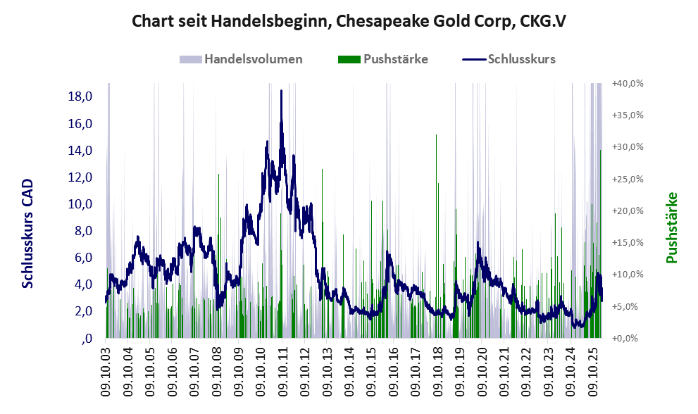 Bei dieser Aktie, über die Stockinvest berichtet, liegt das Refreshmodell vor. Das tägliche Handelsvolumen betrug an obiger Börse während der letzten drei Monate bis Berichtsdatum: 183.322 Stück, das sind 0,2% der ausgegebenen Aktien. Bei Chesapeake Gold fehlt ein operatives Geschäft, stattdessen wird das Geld der Investoren verbrannt.