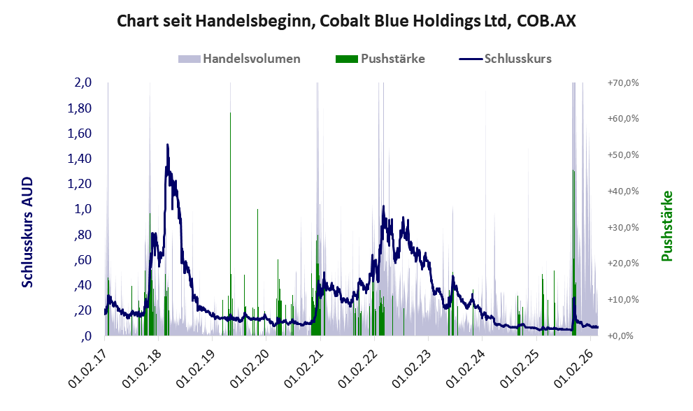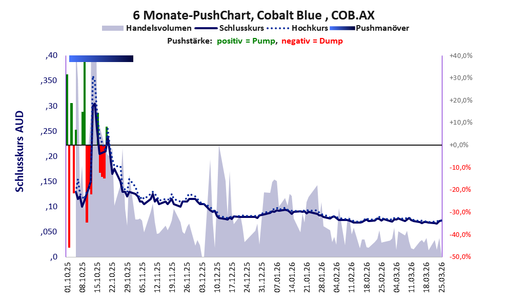 Bei dieser Aktie, über die w:o berichtet, liegt das Refreshmodell vor. Das tägliche Handelsvolumen betrug an obiger Börse während der letzten drei Monate bis Berichtsdatum: 1.912.581 Stück, das sind 0,3% der ausgegebenen Aktien. Da Cobalt Blue kaum Vermögen besitzt und unprofitabel ist, hat der Aktienkurs keinen Wert. Die Aktie dient in erster Linie Pushmanövern.
