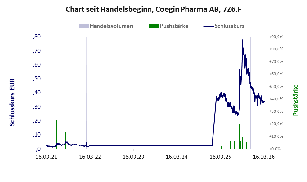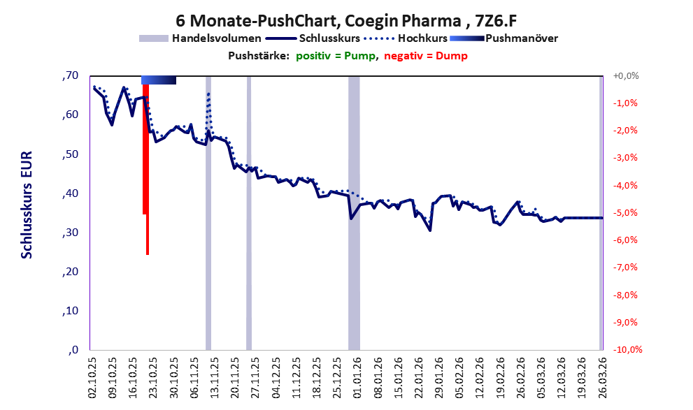 Bei dieser Aktie, über die w:o berichtet, liegt das Refreshmodell vor und es gibt 1 Pump & Dump-Manöver. Das tägliche Handelsvolumen betrug an obiger Börse während der letzten drei Monate bis Berichtsdatum: 490 Stück, das sind 0,0% der ausgegebenen Aktien. Da Coegin Pharma kaum Vermögen besitzt und unprofitabel ist, hat der Aktienkurs keinen Wert. Die Aktie dient in erster Linie Pushmanövern.