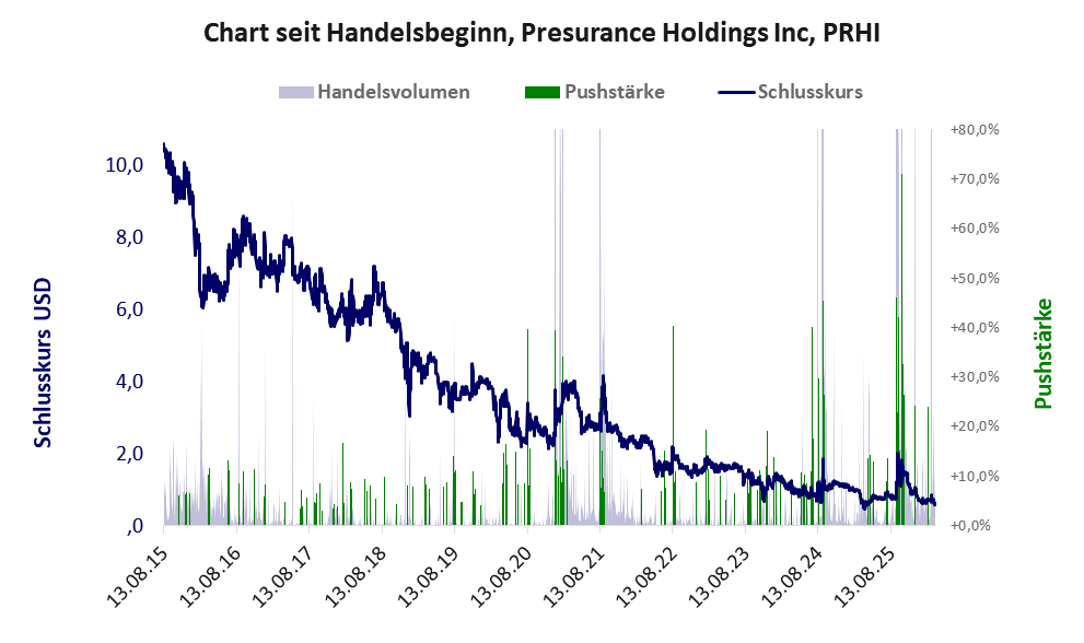 Das tägliche Handelsvolumen betrug an obiger Börse während der letzten drei Monate bis Berichtsdatum: 104.135 Stück, das sind 0,4% der ausgegebenen Aktien. Bei Presurance Holdings rechtfertigt das schwache operative Geschäft nicht die Geldverbrennung.