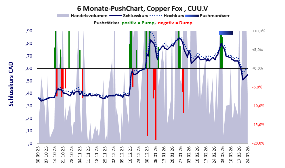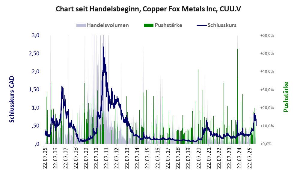 Über diese Aktie berichtet Streetwise. Das tägliche Handelsvolumen betrug an obiger Börse während der letzten drei Monate bis Berichtsdatum: 231.837 Stück, das sind 0,0% der ausgegebenen Aktien. Bei Copper Fox fehlt ein operatives Geschäft, stattdessen wird das Geld der Investoren verbrannt.