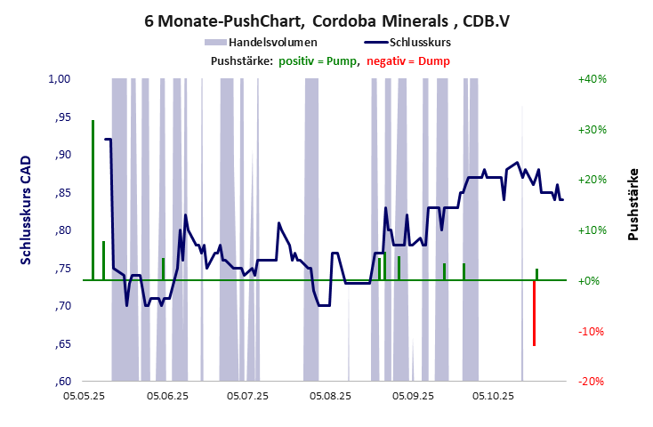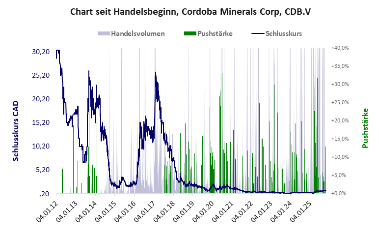 Cordoba Minerals ist nichts wert, auch nicht der Diskussion. Die Aktie dient nur noch der Spekulation. Cordoba Minerals hat ein schwaches Gesamtscoring und ist ein Pennystock mit praktisch einem Totalverlust. Das Gesamtvermögen ist überschaubar, die Vermögenswerte scheinen noch werthaltig zu sein, der Umsatz ist nicht existent, die Ertragslage extrem verlustreich, die Geldverbrennung extrem hoch.