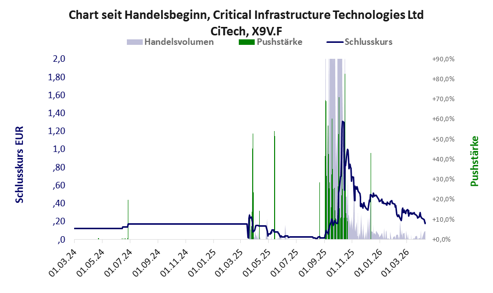 Ein ziemlich wertloses Unternehmen in einem Netzwerk bekannter Akteure, dessen Kurs Anfang Sept. 2025 massiv und eindeutig gepusht wurde. Mit diesem Pushmanöver hat CiTech 2025 den Vogel abgeschossen und als Top-Push vermutlich eine Gewinnquote von 1 : 75 erzielt. Die Taschen der Anleger wurden perfekt geplündert.