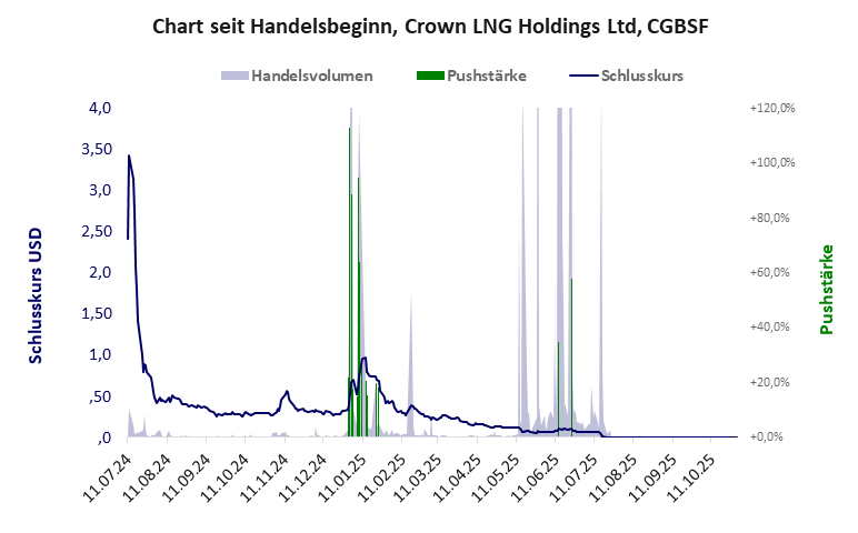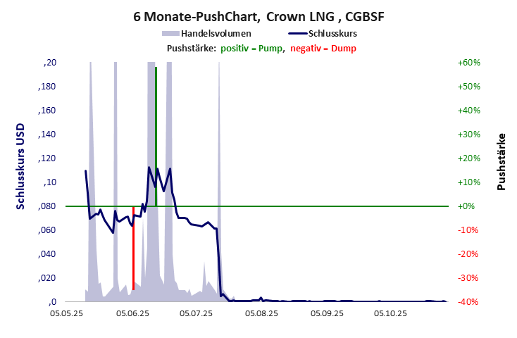 Crown LNG ist ein intransparentes Unternehmen mit vermutlich nur finanziellem Engagement in vier Projekten, über die es so gut wie keine Informationen gibt (siehe Homepage). Crown hat so gut wie kein Personal und keinen eigenen Betrieb. Der Aktienkurs zeigt zwei klare Anzeichen von Pushmanövern (Bild links), ungewöhnliche Kursmuster (Bild Mitte) und Tagesdumps (Bild rechts). Am 13.06.25 erfolgten zu Beginn und Ende des Handels Verkäufe im Wert von gut 30 Mio. USD. Crown LNG hat ein unbefriedigendes Gesamtscoring und ist ein mickriger Pennystock mit praktisch einem Totalverlust. Das Gesamtvermögen ist groß, die Vermögenswerte scheinen nicht vorhanden zu sein, der Umsatz ist nicht existent, die Ertragslage extrem verlustreich, die Geldverbrennung nicht existent.