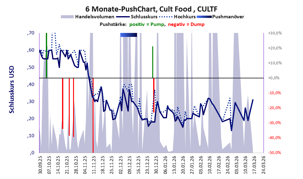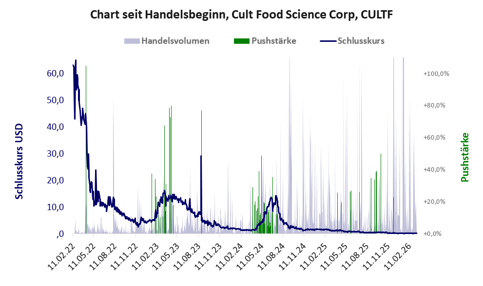 Bei dieser Aktie, über die w:o berichtet, liegt das Inkassomodell vor und es gibt 3 Pump & Dump-Manöver. Das tägliche Handelsvolumen betrug an obiger Börse während der letzten drei Monate bis Berichtsdatum: 5.402 Stück, das sind 0,2% der ausgegebenen Aktien. In Aktien der Klasse V darf man grundsätzlich nicht investieren. Es gibt keinen ordentlichen Geschäftsbetrieb. Die Aktie hat nur den Zweck, mit Pushmanövern oder Algotrading an der Börse Kasse zu machen.
