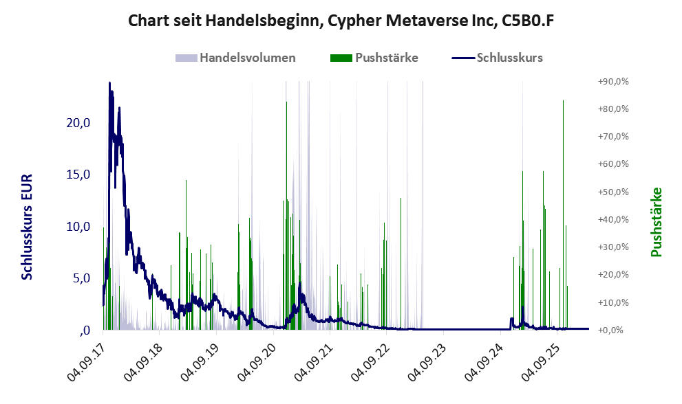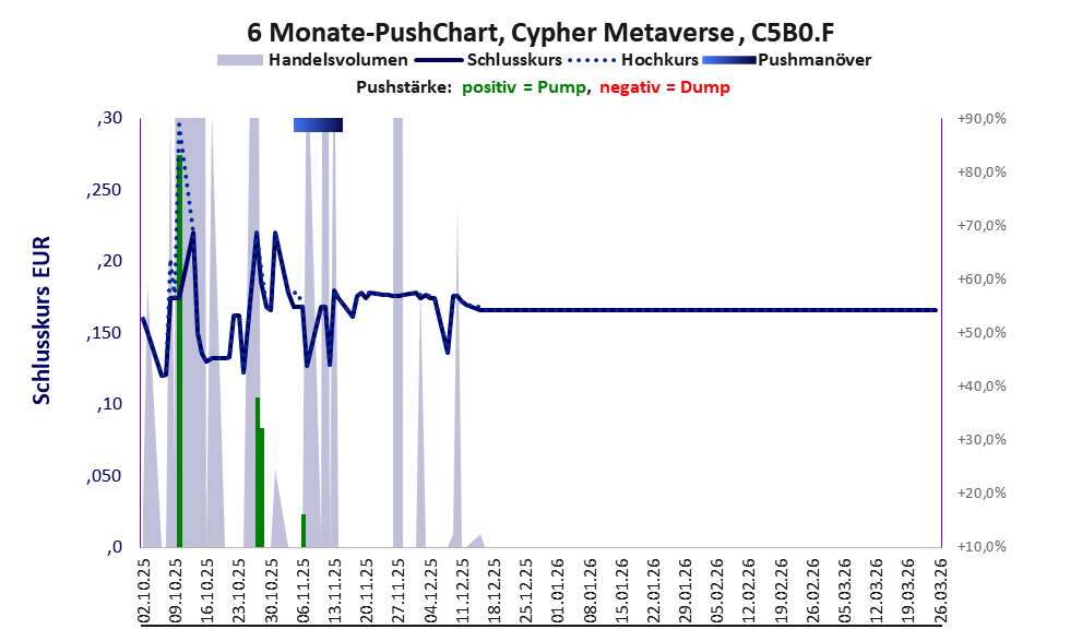 Bei dieser Aktie, über die aktiencheck berichtet, liegt das Inkassomodell vor und es gibt 5 Pump & Dump-Manöver. Es gibt an obiger Börse seit 15.12.25 keinen Handel mehr. In Aktien der Klasse V darf man grundsätzlich nicht investieren. Es gibt keinen ordentlichen Geschäftsbetrieb. Die Aktie hat nur den Zweck, mit Pushmanövern oder Algotrading an der Börse Kasse zu machen.
