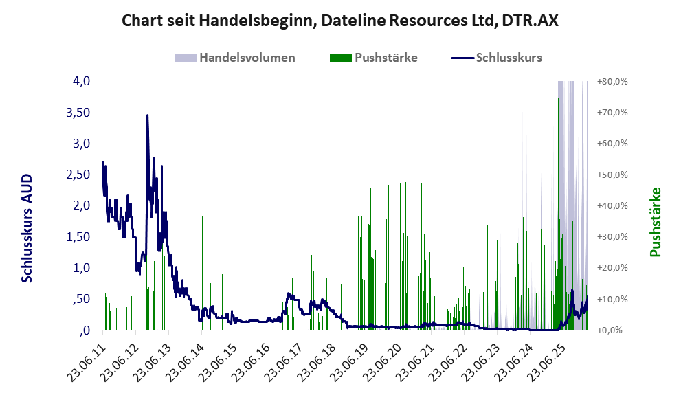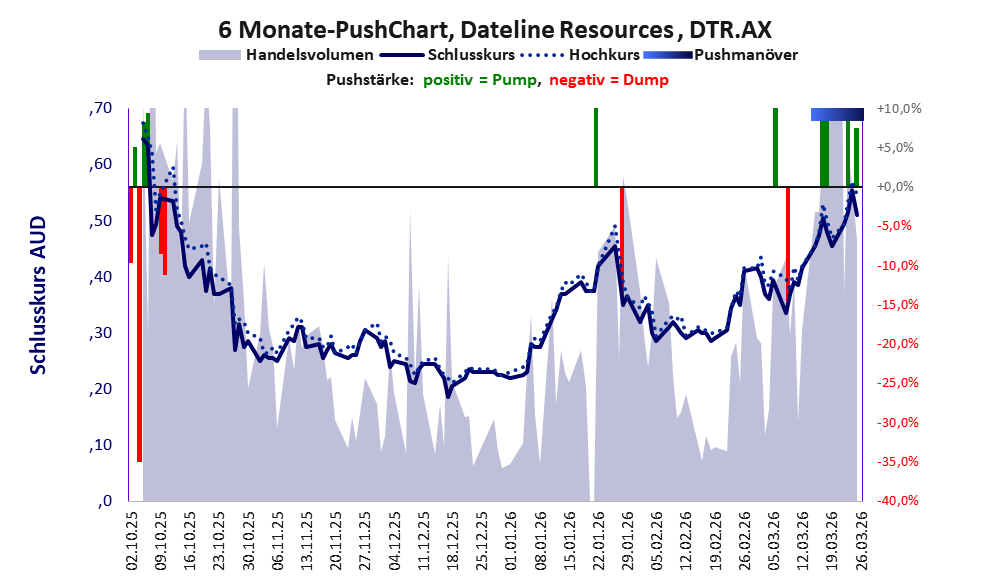 Bei dieser Aktie liegt das Refreshmodell vor. Das tägliche Handelsvolumen betrug an obiger Börse während der letzten drei Monate bis Berichtsdatum: 17.763.380 Stück, das sind 0,5% der ausgegebenen Aktien. Da Dateline Resources kaum Vermögen besitzt und unprofitabel ist, hat der Aktienkurs keinen Wert. Die Aktie dient in erster Linie Pushmanövern.